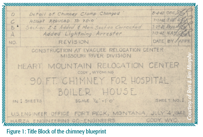 In researching the camp’s infrastructure, the authors examined the U.S. Army Corps of Engineers blueprint from which the chimney was constructed. They were puzzled by what they found. While the title block for the drawing (Figure 1) states clearly “90 Ft. Chimney for Hospital Boiler House,” the plan itself just as clearly shows a structure that is seventy-five feet high. Things seemed to be clearer upon reading the note for Revision C: “Height Reduced to 75’-0”” However, the date of the drawing is July 4, 1942, while the date for Revision C is July 31, 1942; in other words, the chimney’s height was reduced by 15 feet about three weeks later. The speed of construction was so great to get the Camp built that in that three-week span, much of the chimney may have already been constructed. In essence, the height of the chimney may have been reduced from 90’ to 75’ at the last possible minute. Why did the finished product not reach the heights that were originally intended?
