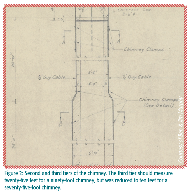 Figure 2 shows a portion of the chimney’s original engineering blueprint. While the interior opening of the chimney is consistent throughout its height, the exterior has three distinct cross-sections, highlighted by two step-back shelves. The drawing shows the top two tiers of the chimney, measuring twenty-five feet and ten feet in height respectively, making the overall chimney height at seventy-five feet. The lower portion measures forty feet. Revision C reduced the topmost portion of the chimney by fifteen feet, from twenty-five feet to ten feet.