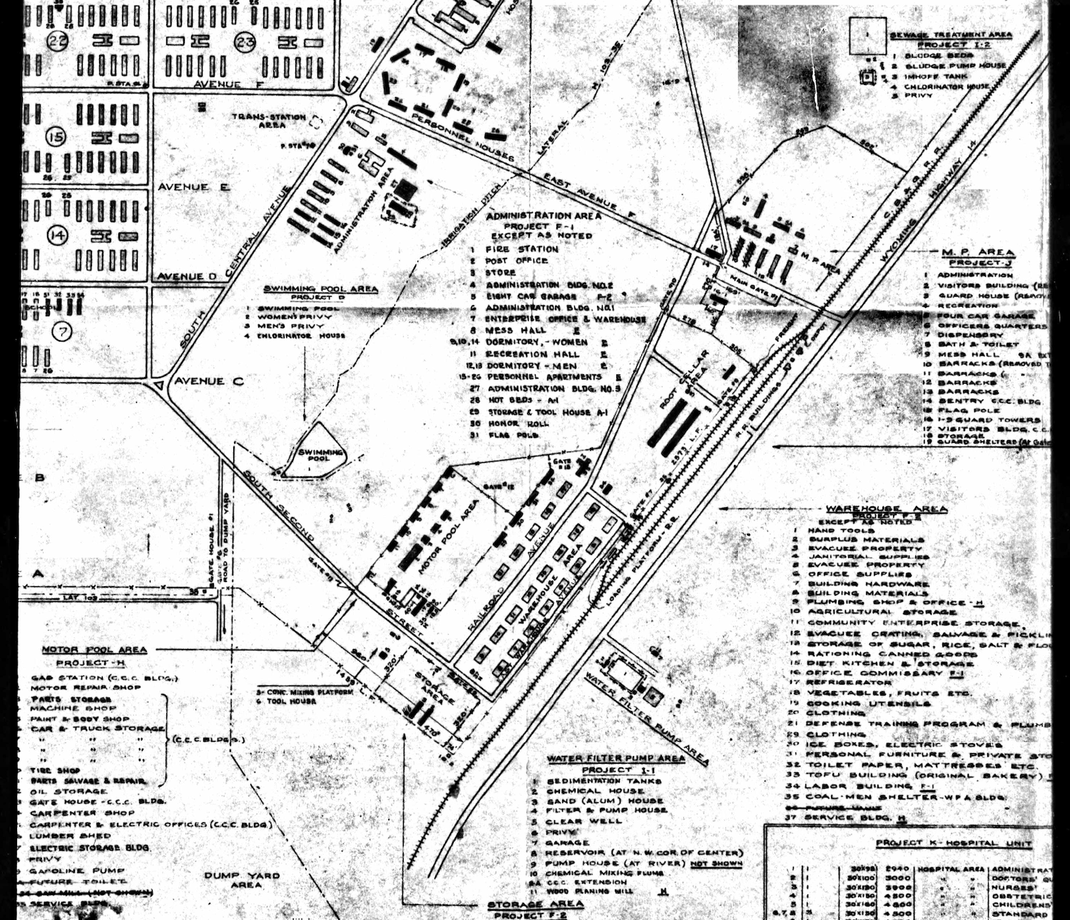 National Archives and Records Administraion, “Plan of Center Area,” Heart Mountain Relocation Project-Blueprint, image 239,Ancestry.com database online