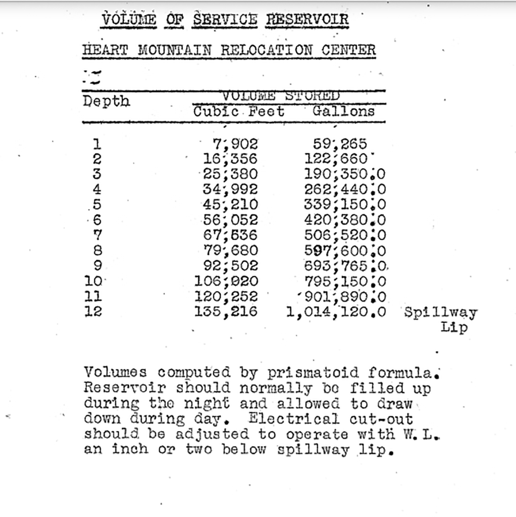 Water volume in the service reservoir, supplying water to the Camp. National Archives, War Department, Office of the Area Engineer. Completion Report: Heart Mountain Relocation Center, September 22, 194, Appendix E-1.